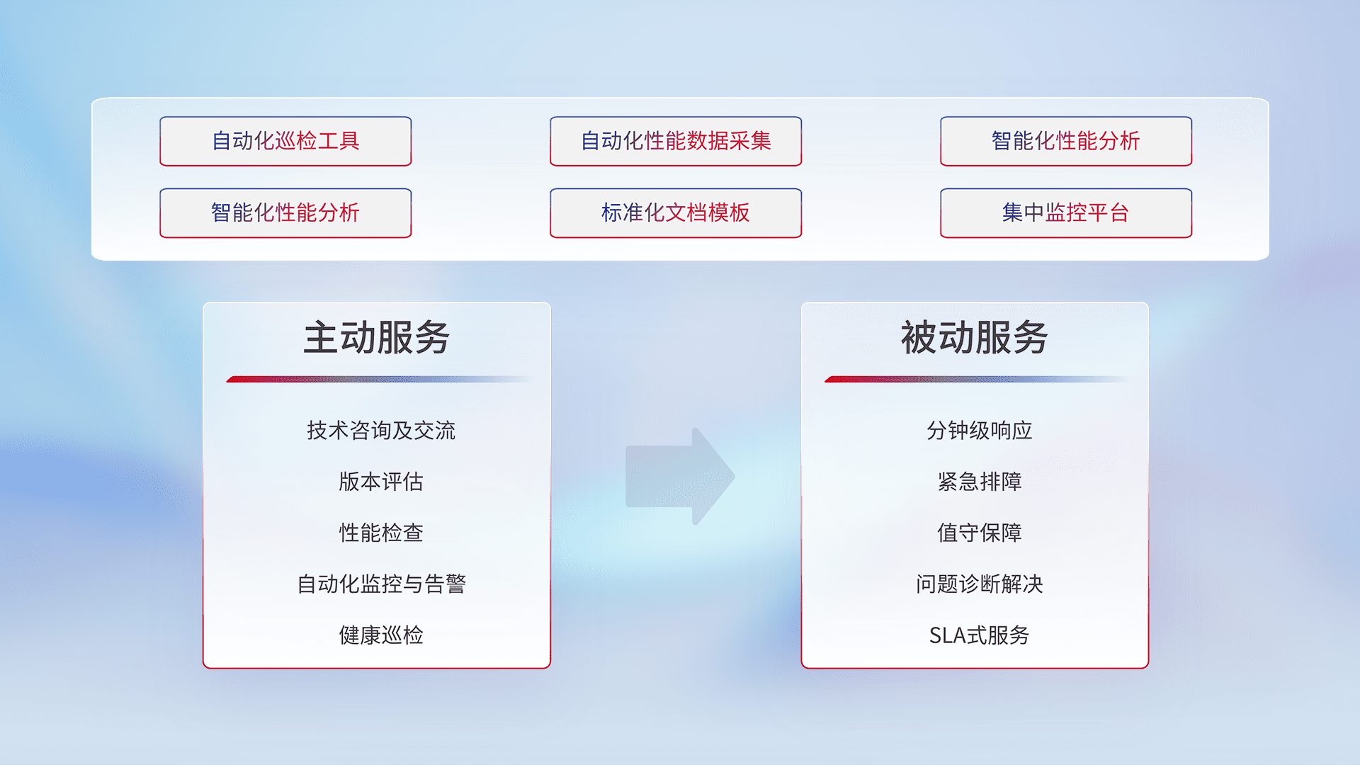 智能化工具和标准化文档,,,,保障服务质量,,,提供主动服务(包含技术咨询、、、版本评估、、、性能检查、、、自动化监控与告警、、健康巡检)和被动服务包含(分钟级响应、、、紧急排障、、值守保障、、、、问题诊断解决、、SLA服务)。。